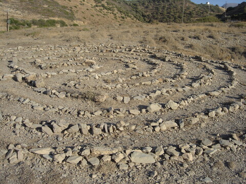 A friend has told us where to find the labyrinth: not far from a threshing floor on the barren hillside on the outskirts of the village. There were several circular threshing floors in this village once, slabs of concrete edged with paving stones, last used perhaps thirty years ago at harvest time. On summer nights I often sat within that magic space stargazing at the frothy spirals of the milky way and in the day time, sometimes, I danced. No other landscape had ever inspired me to dance with joy as Crete did when I was twenty-five. Observed by no one but the rocks and a friendly donkey tethered nearby, I whirled in a purple granny dress and flung my arms out towards the cobalt sea in gestures of longing, benediction, and pure delight. I did not know then that dance was a form of worship in ancient times, but something in the landscape spoke directly to my body and my feet.
